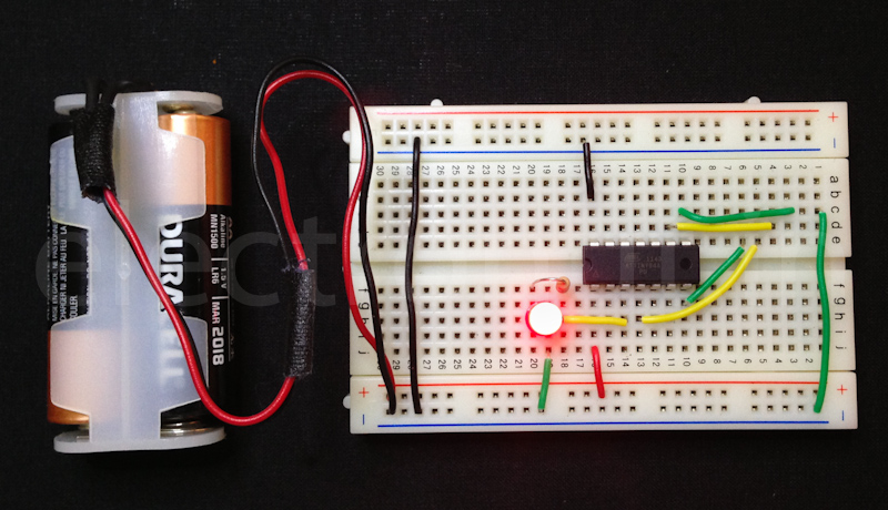 Once you program the chip, you don't need the programmer, and here you can see the chip working directly from the 3V battery: