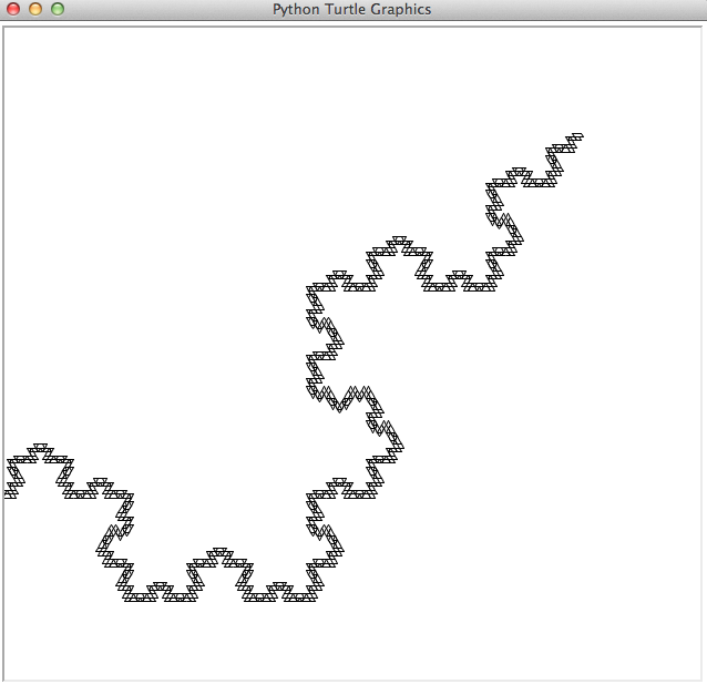 Keep repeating the above procedure, and guess what you get? Something astonishingly similar to the Koch snowflake! This idea has been explored by Jun Ma and Judy Holdener, in their 2005 paper "When Thue-Morse Meets Koch" [3]. The paper is not for the faint of heart, and although I am no mathematician, it looks like you need a background in Abstract Algebra and Topology to understand it. But you don't need to know much to draw it. Here is what you get when you put turtle to task to draw the above.