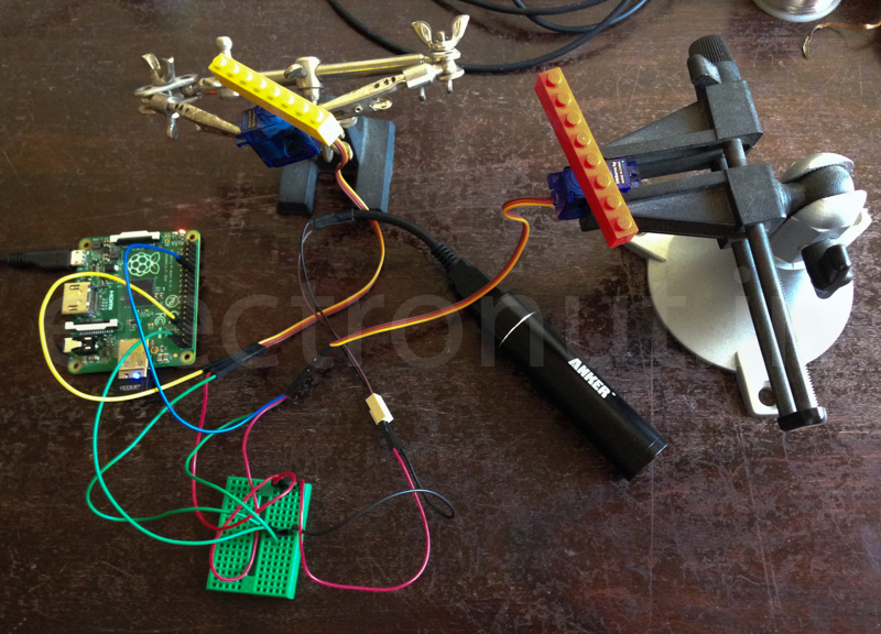 I hooked up two servos to my Pi. The signal lines of the servos are connected to the Pi's hardware pins (GPIO18 and GPIO13), and the servos are powered separately. (My Anker rechargeable 5V battery has battery can barely power these. I'll need to set up a LiPo battery.)